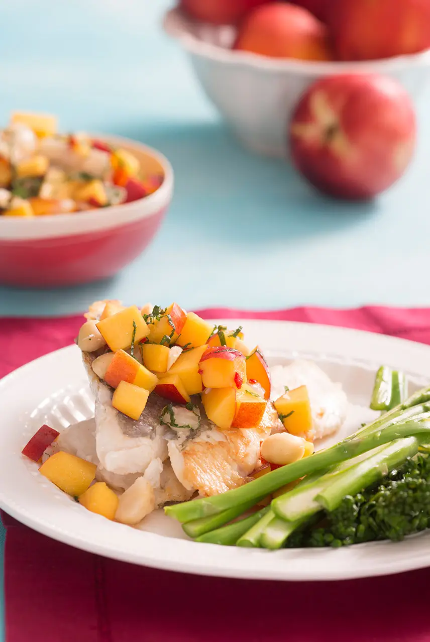 Bring a saucepan of water to the boil, season with some salt and add asparagus and broccolini, blanch for 1-2 minutes, drain. Serve hot vegetables with fish topped with Nectarine Salsa.